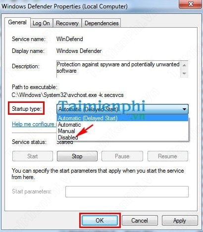 Bước 5: Tại tùy chọn Startup Type bạn nhấn chuột và chọn Disable như hình dưới sau đó nhấn OK để lưu thiết lập