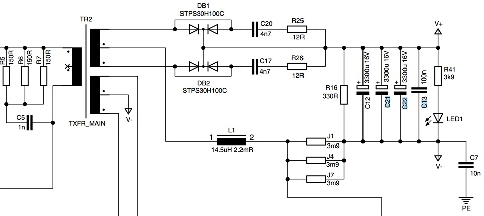 Khối chỉnh lưu điện áp ra là khối chuyển đổi điện áp AC sau biến áp TR2 qua diode chỉnh lưu để tạo điện áp DC ngõ ra ví dụ như DC 5V, DC 12V, DC 24V..Diode chỉnh lưu sau biến áp là diode có tần số đáp ứng nhanh ( hay còn gọi là diode Schotky). Trong sơ đồ mạch sử dụng là diode STPS30H100C. Các loại thường sử dụng như diode MBR40100PT...