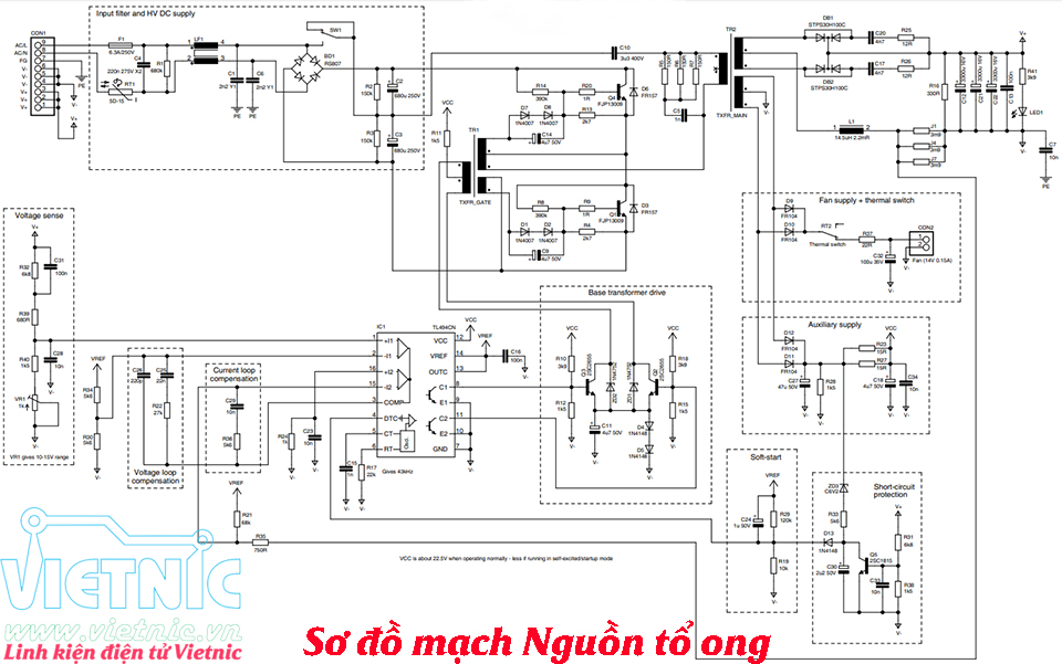 Đối với Khối dao động PWM dùng IC UC3845 hoặc UC3843 để tạo xung điều khiển mosfet công suất. Mosfet thường dùng là 20N60C3, 15N60..( Trong bài viết này vietnic đang giới thiệu nguồn xung sử dụng transistor )